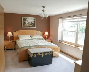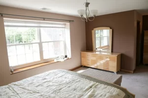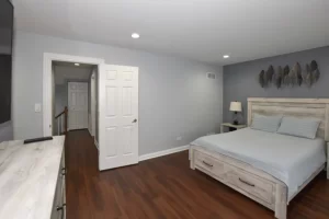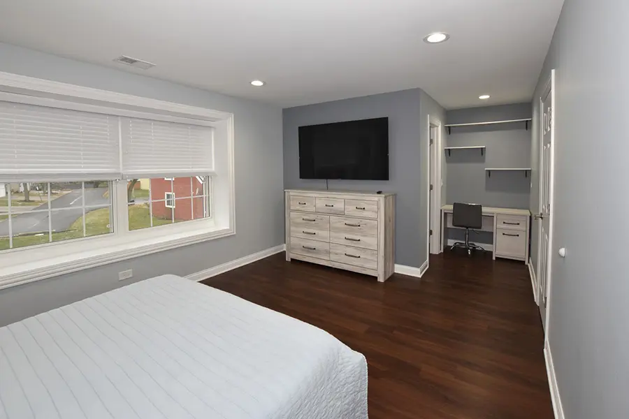 The bedroom remodel at this home included updates to the layout, design, and finishes. The old, cramped layout was reconfigured to create a more open and functional space, with the addition of built-in storage and a seating area. The room now boasts a fresh, modern color palette and new flooring, as well as updated lighting and window treatments. Overall, the finished bedroom is a comfortable and stylish retreat that the homeowners can enjoy for years to come.